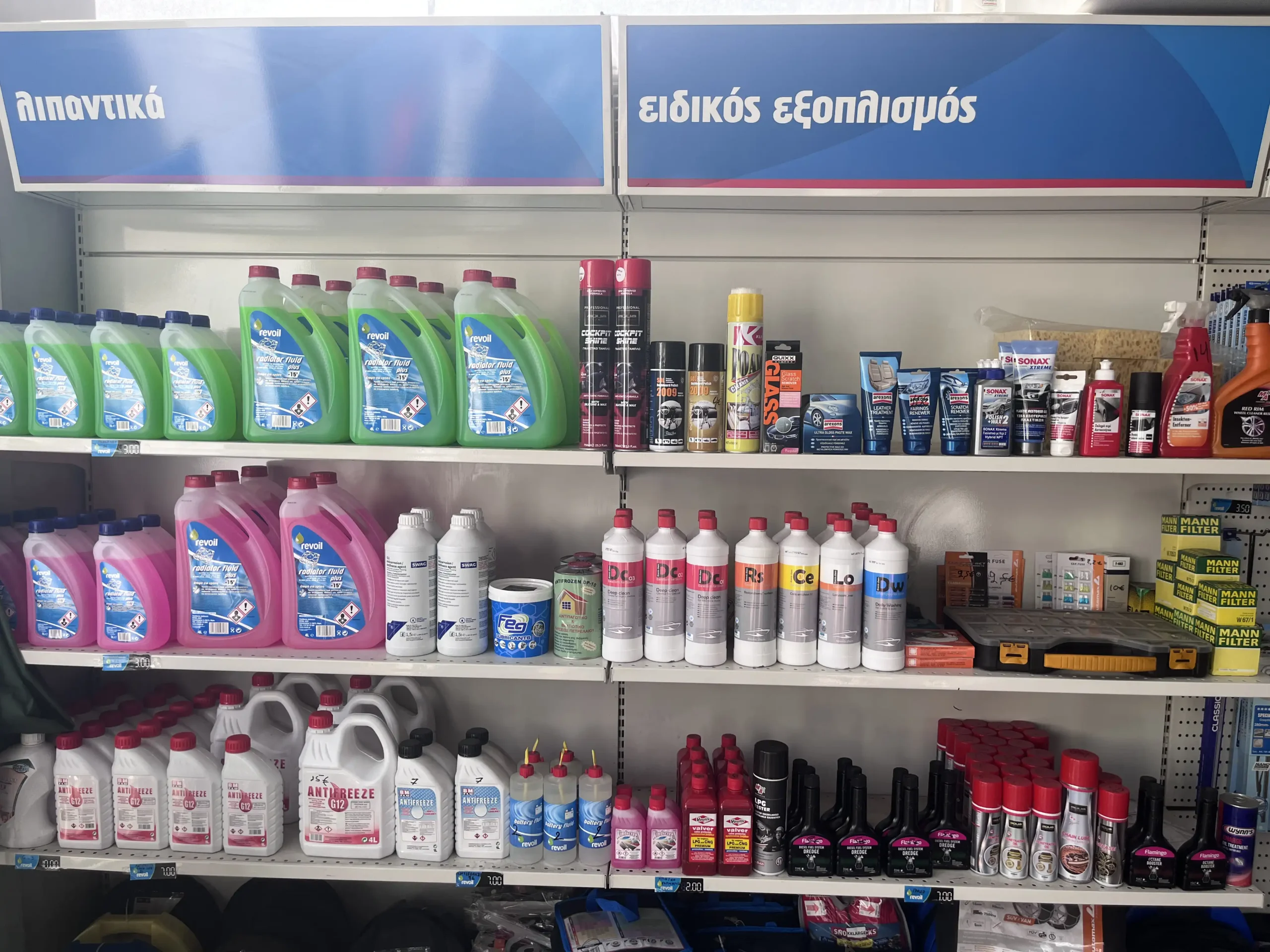 Στα πρατήρια μας σε Ηλιούπολη και Δάφνη, θα βρείτε μια πλήρη γκάμα αξεσουάρ αυτοκινήτου για να διατηρείτε το όχημά σας σε άριστη κατάσταση, ανεξαρτήτως εποχής και συνθηκών. Από βασικά αναλώσιμα μέχρι εξειδικευμένα προϊόντα, έχουμε ό,τι χρειάζεστε για την ασφάλεια, την απόδοση και την άνεση του αυτοκινήτου σας.